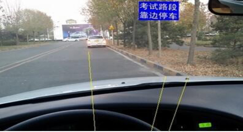③根据考试车型,有些地区的车会佩戴小镜子,所以看车前面的小镜子里两条线选基本重合时便停车,不过要看车身的条件,还是要靠自己;