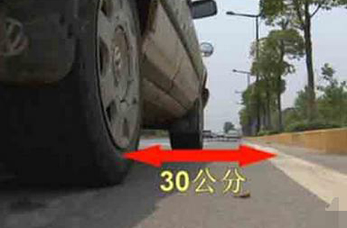 ②如果能把车头分为三等分的话也可以看车头的1/3处的点位,当点位与边线重合时,车轮与边线的距离也就在30cm的距离;